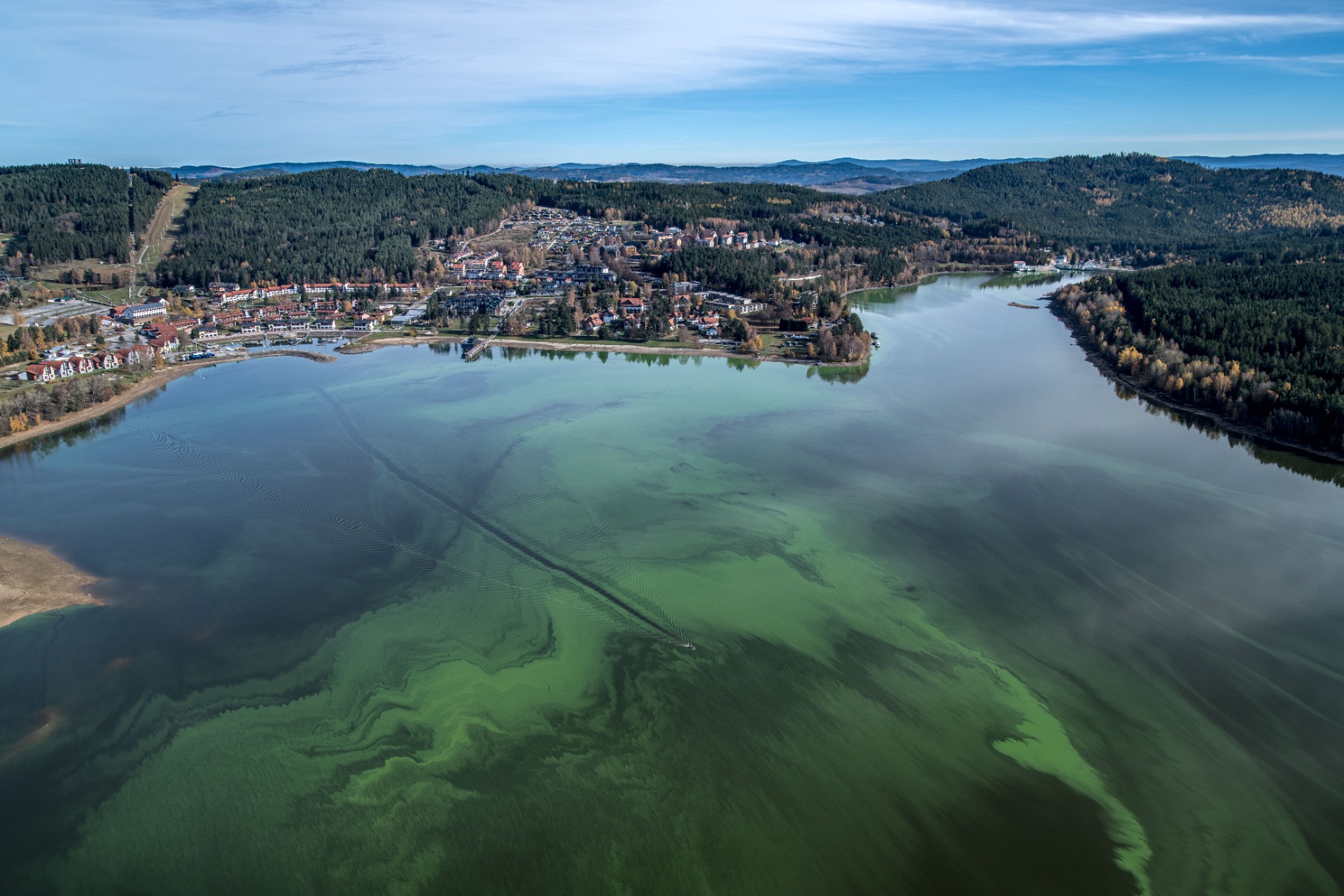 Obrázek 1. Neobvyklý pohled na vodní květ sinic v nádrži Lipno nedaleko Dolní Vltavice, říjen 2017.